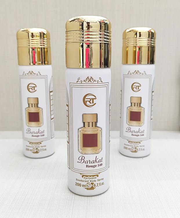 اسپری بدن معطر Barakat Rouge ک محصول یونیسکس (مناسب برای خانمها و آقایان) از برند Fragrance World است. این اسپری بدن، الهام گرفته از عطر معروف Baccarat Rouge 540 از Maison Francis Kurkdjian است. رایحهای شرقی و چوبی دارد و شامل نتهای بالایی از بادام تلخ و زعفران، نتهای میانی از یاس و سدر و نتهای پایه از عنبر، نتهای چوبی و مشک است. برای استفاده در تمام فصول مناسب است و ماندگاری خوبی دارد. این محصول در حجمهای مختلفی مانند 200 میلیلیتر و 250 میلیلیتر عرضه میشود.